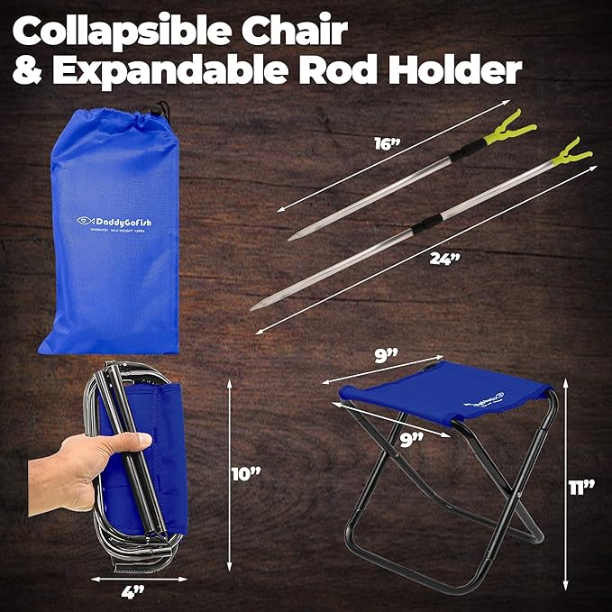 • COLLAPSIBLE CHAIR AND ROD HOLDER - Kids have a place to rest wherever they go. The rod holder keeps the fishing pole off the ground and minimizes the chance of accidental damage.
