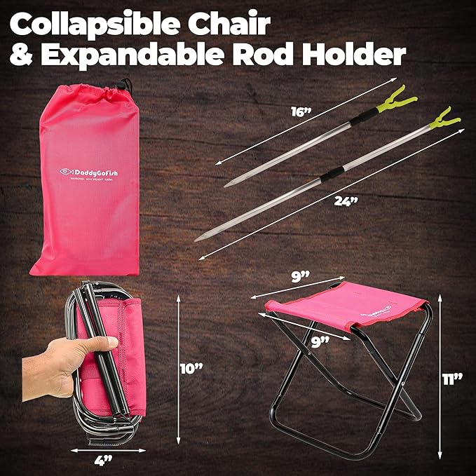 • COLLAPSIBLE CHAIR AND ROD HOLDER - Kids have a place to rest wherever they go. The rod holder keeps the fishing pole off the ground and minimizes the chance of accidental damage.