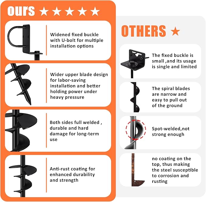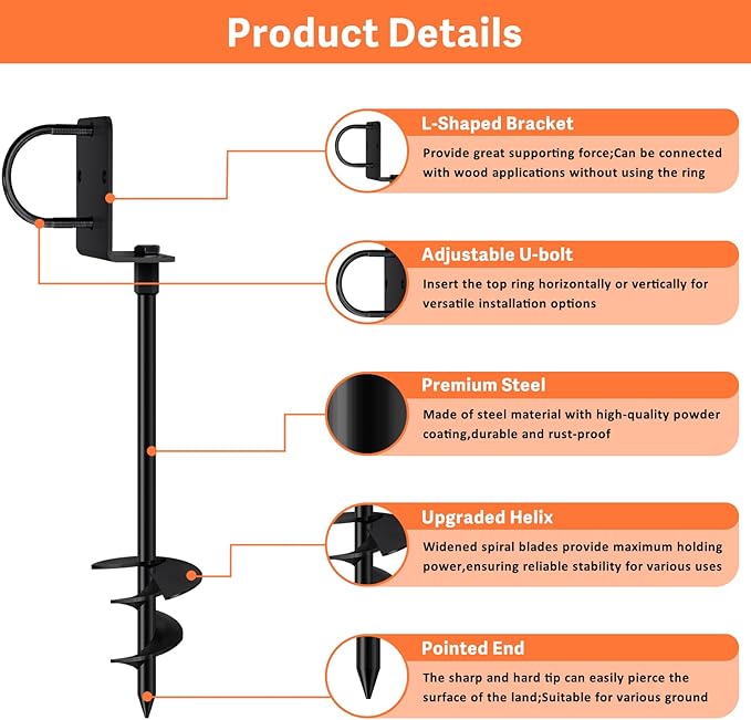 • Complete set for your convenience: These tent stakes include all the necessary components for a hassle-free installation, making it an ideal choice for both DIY enthusiasts and professionals.You will receive 4×ground anchors,4× brackets,4×top rings,4×hex head screw bolts with washers,8×screws with washers,a 14mm adapter and an open-end wrench.