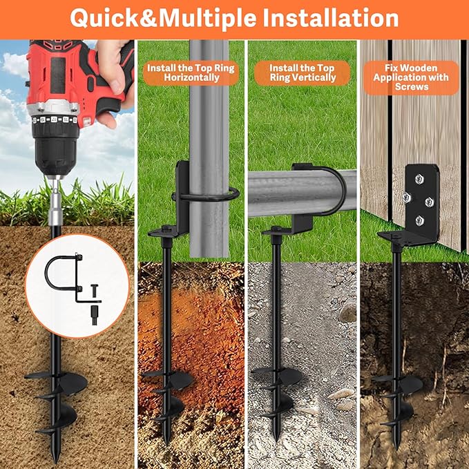 • 3 installation scenario: These anchors can be installed horizontally or vertically by adjusting the top ring, or screwed into the wooden application by unscrewing the top ring, widely apply to such as trampolines, shed, carport, greenhouse,canopy,gazebo,dog tie-outs.