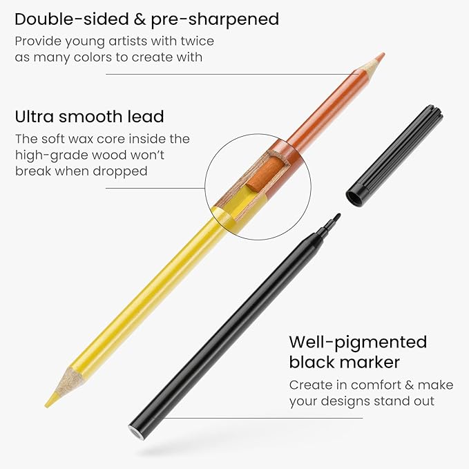 • Set Includes 12 Double-Ended Colored Pencils in 24 Colors: Our coloring book set also included colored pencils for kids, one pencil sharpener, one eraser, and one black marker.
