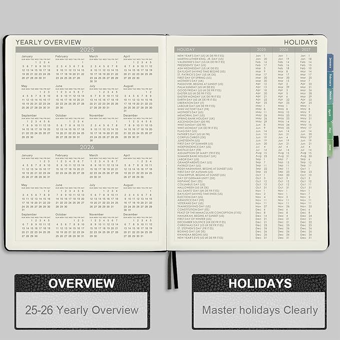 • 🔲 Durable soft leather cover, excellent texture. 2025-2028 yearly holidays lets you master the holidays clearly. The planner offers unruled monthly pages/ruled weekly layouts for detailed planning.