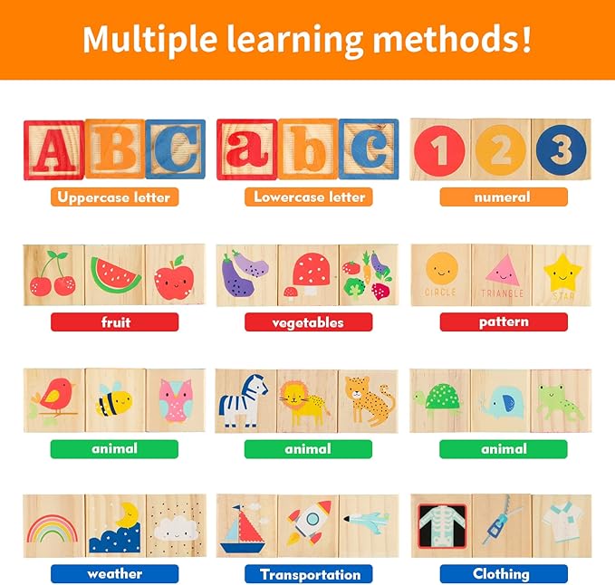• ALPHABET&NUMBER BLOCKS SET: Our 30 piece wooden abc/number blocks for a total of 180 sides, each side is unique and carefully designed. One side of each block is uppercase and the opposite side is the lowercase, and the other sides contain colorful pattern of shapes, animal, fruits, vegetables. The abc blocks are great building blocks for toddlers and preschoolers for introducing letters of the alphabet, color recognition, reading and writing in a fun way in preparation for kindergarten