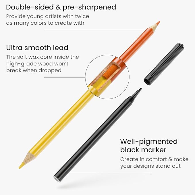 • Set Includes 12 Double-Ended Colored Pencils: Our doodle book also includes colored pencils for kids, one pencil sharpener, one eraser, and one black marker.