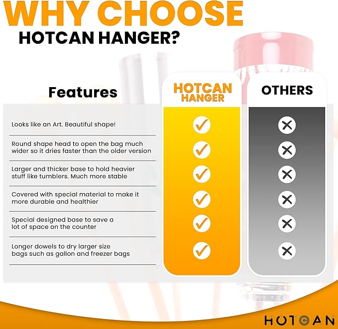 • Special Knob Design: The Knob On Each Dowel Opens The Bag Much Wider So That The Bags Dry Much Faster Than Older Version Dryer Racks. Your Bags Will Dry In A Blink! And You Can Dry 8 Gallon Or Freezer Bags Simultaneously!