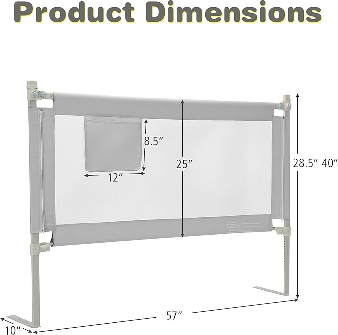 • [ Safe Bedrail with Storage Pocket ]: Measuring 57” x 28.5” (L x H), this long bed rail effectively protects children, especially active babies, from falling out of the bed. In addition, the side pocket can be used to store baby’s daily utensils, such as nursing bottles, toys and diapers.