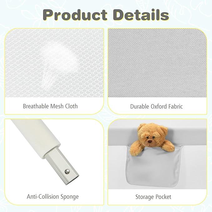 • [ Kids-friendly Material with Safety Ensured ]: The frame of bed rail is made of sturdy steel and wrapped with anti-collision cotton & premium oxford cloth, which ensures excellent stability, safety and durability. What’s more, the breathable mesh keeps good air circulation and is convenient for parents to observe children. By the way, the cloth is easy to remove for daily cleaning.