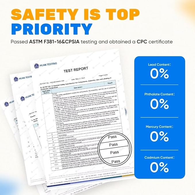 • 【Safety is Top Priority】Experience peace of mind with the ORCC Trampoline, now boasting CPC certification in the USA, rigorously tested under CPSIA guidelines. Meanwhile, our trampoline, tested to ASTM F381-16 specifications, ensures a structure that excels in firmness, and UV protection, exceeding industry standards and providing a safe, durable option for endless fun.