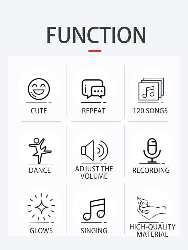 • 120 Songs on Loop: Talking Cactus toy comes with 120 songs in English,including nursery rhymes and TikTok hits. When in the battery,the cactus sings,dances and glows. Let your child dance to the music and cactus. This healthy,positive interaction lends itself to a child's education