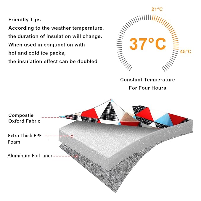 • HIGH QUALITY MATERIALS: Made of high quality water-resistant composite oxford fabric, 8mm extra-thick EPE foam and food-grade aluminum foil liner. No odor, non-toxic, food safe, durable, lightweight. Effectively keep bottles stay cold, warm or fresh for hours, it keeps breast milk fresh.
