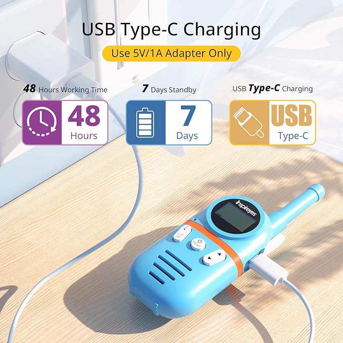 • Inspireyes rechargeable kids walkie talkies are rechargeable and long lasting, featuring an upgraded built-in lithium polymer battery. There is no need to buy extra AAA batteries. Kids can enjoy up to 48 hours of playtime and 7 days of standby on a single charge.
