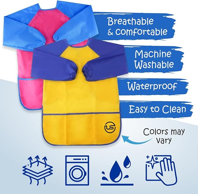 • Machine washable smock for kids – we included in our ultimate kid paint set a toddler paint smock designed with kid-friendly waterproof polyester fibers that are nontoxic and smooth. Fits on most kids ages 2-7.