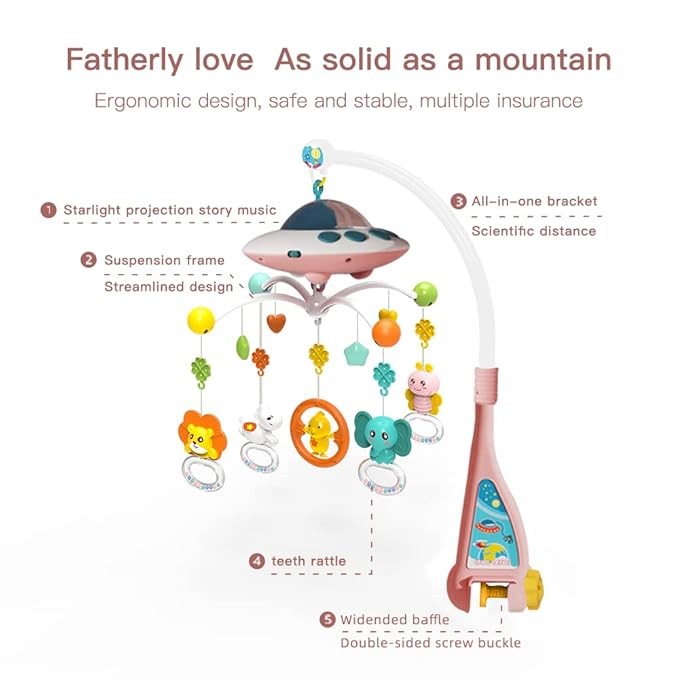 • Safe Crib Toy - Crib mobile is made of safe ABS material, BPA free. The crib mobile is designed to be as safe and stable as a fatherly love. Its bracket spacing science. Its suspension frame has a streamlined design. The baffle is widened and double-sided turnbuckles can prevent slipping and falling off. These provide a variety of insurances for the safety of the baby.