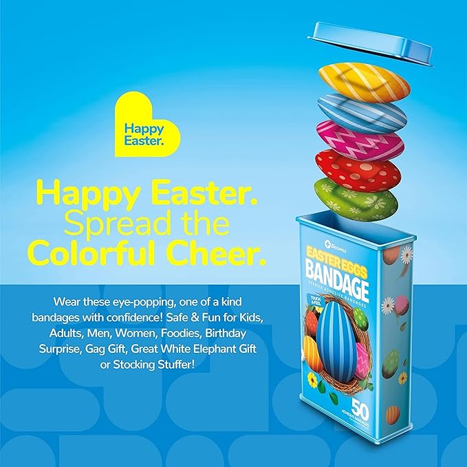 • EASTER EGG BANDAGES: This 50 piece tin of adorable Easter eggs bandages is great for putting a smile on kids' faces while protecting wounds such as cuts, scrapes, and burns, and come in 5 assorted styles; sticky bandages are perfect for kids and adults alike, and also for school nurses and pediatric doctors