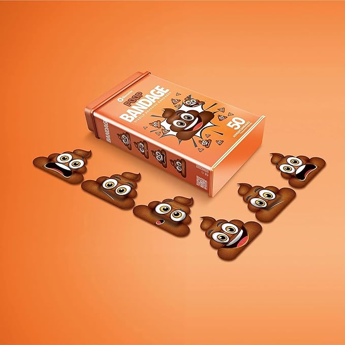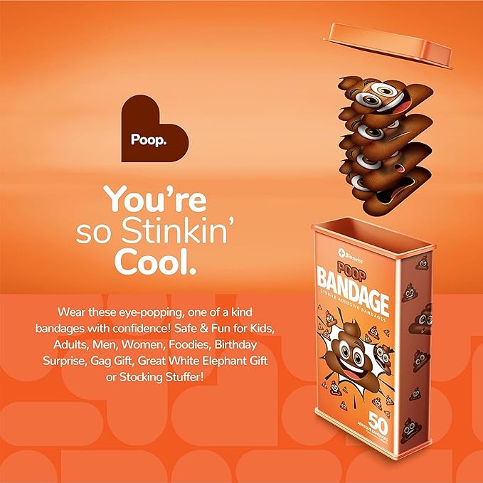 • POOP BANDAGES: This 50 piece tin of funny poo bandages is great for putting a smile on kids' faces while protecting wounds such as cuts, scrapes, and burns, and come in 4 assorted styles; sticky bandages are perfect for kids and adults alike, and also for school nurses and pediatric doctors