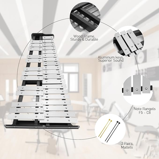 • 【32 Notes Professional Glockenspiel】 Note range: F5 - C8. Each note is marked on the corresponding beat, each of them is perfectly tuned and tested. The thick aluminium keys with 2 beaters produce a very long and clear percussion sound.