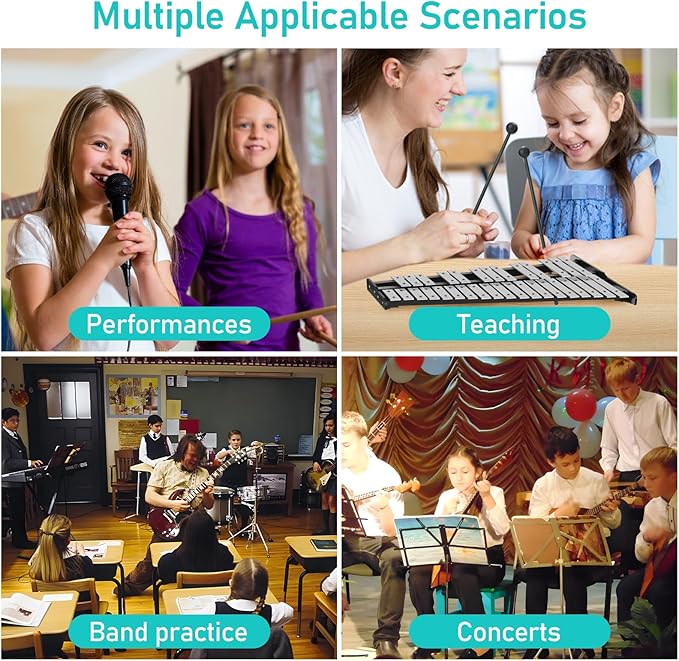 • 【High quality and stable structure】Selection of aluminium plates for a 32-note percussion glockenspiel that is durable and durable. The floor stand is metal coated and constructed in a triangular structure that has a stable structure. The non-slip pads on the bottom also increase the stability of the stand.