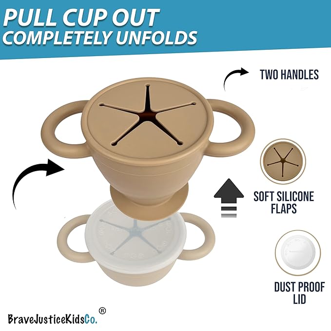 BraveJusticeKidsCo. | Snack Attack II Snack Cup | Collapsible Silicone Snack Container | Toddler and Baby Snack Catcher Lid (Warm Sand)