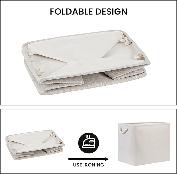 • [Foldable Baskets Set] Simply fold the canvas basket down flat for space-saving storage when not in use or when needing to transport. The basket stays filled for a while and then stays standing. If you mind the creases, you can use an iron to iron the creases in the basket. If you do not use an iron, the creases will slowly disappear as you store your items.