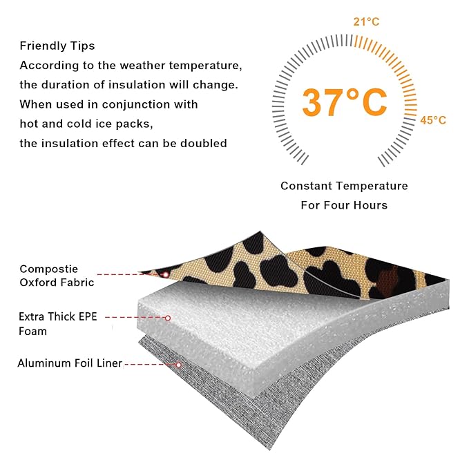 • HIGH QUALITY MATERIALS: Made of high quality water-resistant composite oxford fabric, 8mm extra-thick EPE foam and food-grade aluminum foil liner. No odor, non-toxic, food safe, durable, lightweight. Effectively keep bottles stay cold, warm or fresh for hours, it keeps breast milk fresh.