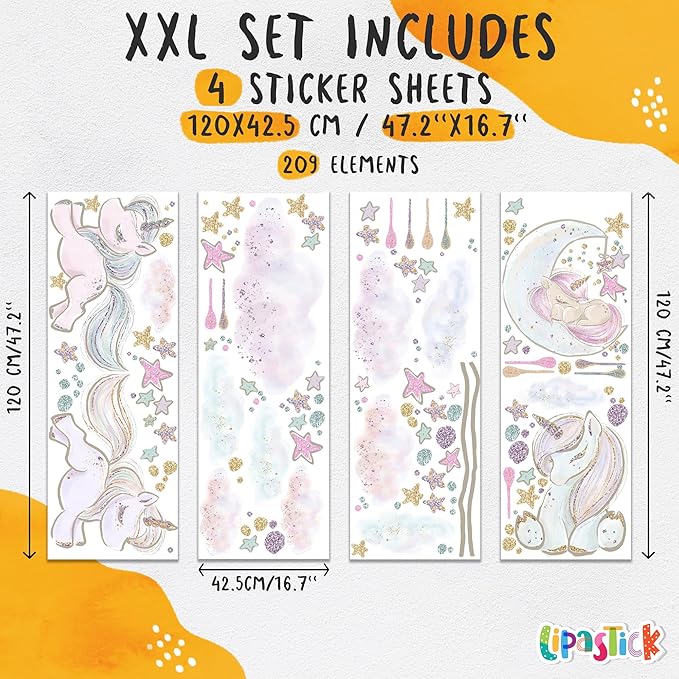• πŸ¦„ Package Content: Large decals for baby room come in a pack of 4 sheets. Includes: unicorns, stars, clouds, moon. The sheet size is 47.2" x 16.7". This set of stickers is size XXL and its finished size is 156.2" x 48”. Perfect for covering full wall.