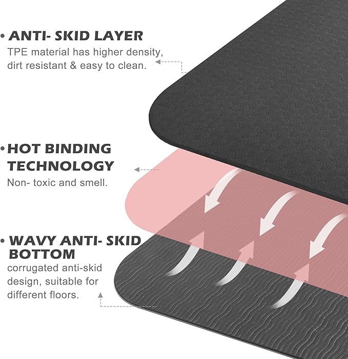 • DOUBLE NON-SLIP DESIGN - This workout mat has double-sided non-slip surfaces. Wavy undersides make excellent traction on the floor. It unrolls pretty flat and stays put. Special textured surface prevents your hands and feet from sliding when you sweat on it.