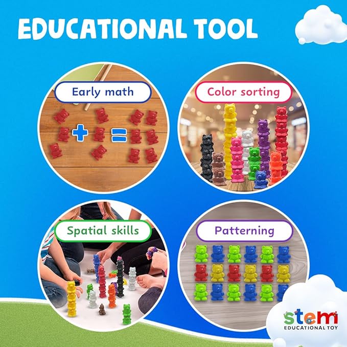 • LEARNING TOYS: Develop early math skills, counting to 50, skip counting, color sorting, matching, one-to-one correspondence, comparison, making 10, Nonstandard measurements, grouping, addition, subtraction, graphing, patterning and color recognition with this set of colorful counting bears