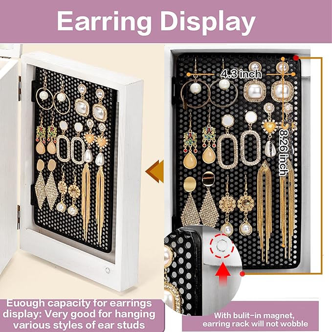 • ❤Large Capacity: The top layer has a built-in mirror and ring tray, 4 pull-out drawers keep your jewelry away from getting messed up, easily store different sizes of jewelry, even necklaces, bangles, and big earrings like hooped earrings. 2 side doors for hanging chunky necklaces and plenty pairs of earrings.