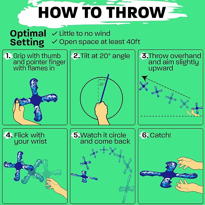 • ๐—˜๐—ฎ๐˜€๐˜† ๐—ง๐—ผ ๐—Ÿ๐—ฒ๐—ฎ๐—ฟ๐—ป: Embrace the simple joy of throwing a boomerang and having it come back to you with ease. With our beginner-friendly easy to throw design crafted from durable EVA foam. It's stable flight and comfortable grip make throwing and catching a breeze, ensuring a quick and enjoyable learning experience for kids age 6 and up.