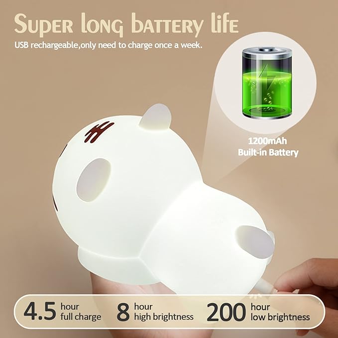 • 🎠1200mAh Rechargeable Battery: 100 hours with sleeping light, long battery life, small size and big energy, just needs to be charged with an adapter (5V-1A) or usb device for 4.5 hours but can work for continuous lighting over 8 hours in high brightness or 200 hours in low brightness. no problem to open all night, sleep peacefully with power saving.