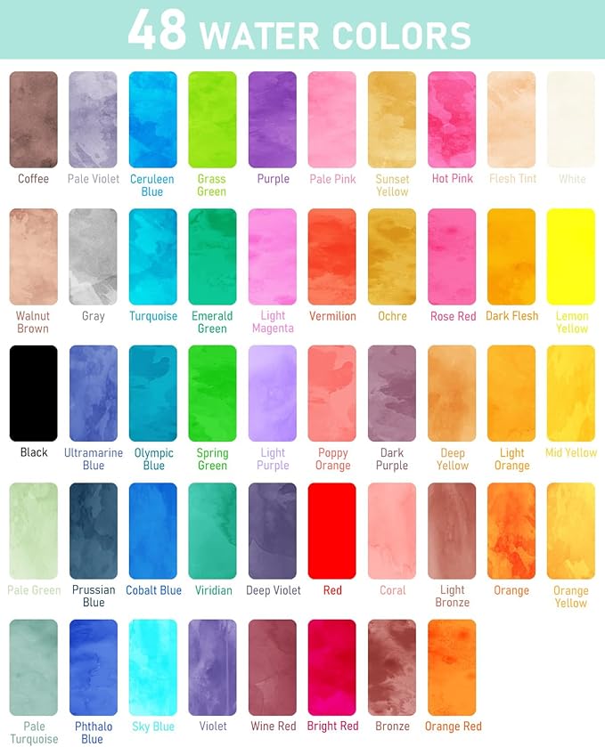 • Handy Art Set: Take our watercolor pan like a notepad.This art set come with 48 colors solid water color paints ,3 pcs painting brushes and a 1 premium refillable water brush pen,the detachable lid can also be transformed into a palette and a brush storage slot. Start painting just with few drops of water.