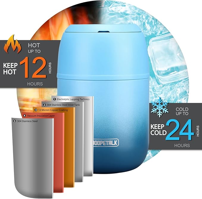 • Joopetalk soup thermo comes with double-wall vacuum insulation technology, that can keep food hot for 12 hours & keep food cold for 24 hours.