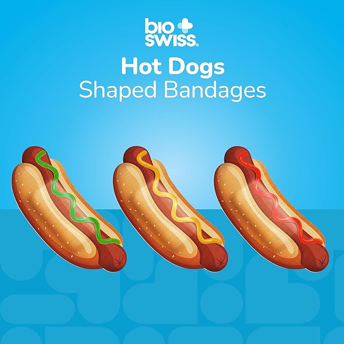 BioSwiss Bandages, Hot Dog Shaped Self Adhesive Bandage, Latex Free Sterile Wound Care, Fun First Aid Kit Supplies for Kids, 24 Count