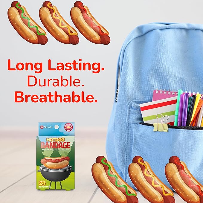• HOT DOG BANDAGES: This 24 piece pack of adorable and delicious looking hot dog bandages is great for putting a smile on kids' faces while protecting wounds such as cuts, scrapes, and burns, and come in 4 assorted styles; sticky bandages are perfect for kids and adults alike, and also for school nurses and pediatric doctors