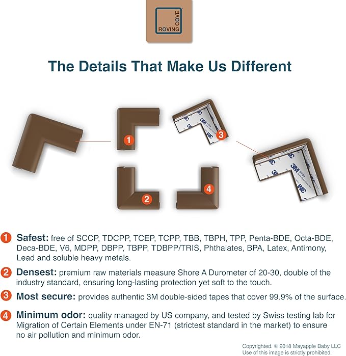 • CLEAN SAFETY: Roving Cove uses safe and pure raw material and was the first brand to make foam safety bumpers without the use of toxic flame-retardant chemicals (SCCPs). Our corner protector contains no BPA, no phthalates, no heavy metals, no latex, no SCCPs. Inherently flame-resistant; passed flammability tests under US regulations.