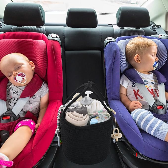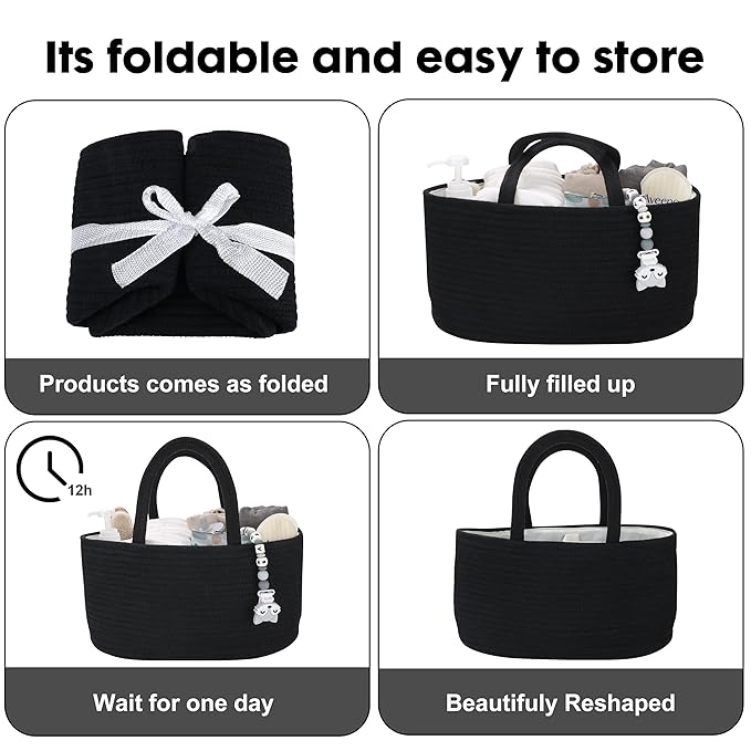 Baby Diaper Caddy Organizer for Girl Boy Cotton Rope Nursery Storage Bin Basket Portable Holder Tote Bag for Changing Table Car Travel Baby Shower Gifts Newborn Essentials Registry Must Haves Black