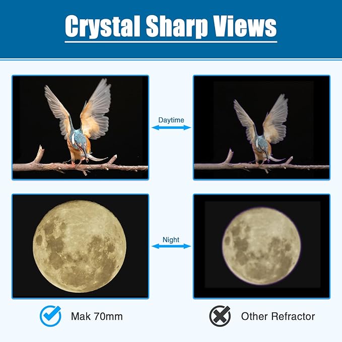 • 【Compact & Powerful】Maksutov-Cassegrain optical design allows 1000mm focal length folded in 210mm length tube. 70mm aperture allows the greater the amount of light entering the telescope and the higher the resolution. It's a camping telescope, easy to pack the compact and lightweight telescope in any backpack and take it for travel.