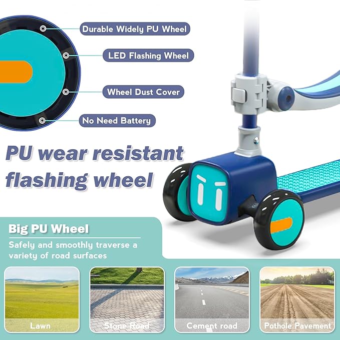 • LEAN-TO-STEER FUNCTIONALITY: Have a unique lean-to-steer function, and a unique ride experience similar to that of a skateboard which means the kick scooter is controlled by leaning rather than turning the steering wheel. helps to develop kids' balance and coordination.