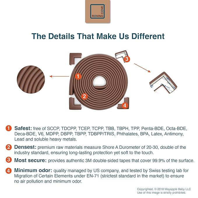 • CLEAN SAFETY: Roving Cove uses safe and pure raw material and was the first brand to make foam safety bumpers without the use of toxic flame-retardant chemicals (SCCPs). Our edge corner guards contain no BPA, no phthalates, no heavy metals, no latex, no SCCPs. Inherently flame-resistant; passed flammability tests under US regulations.