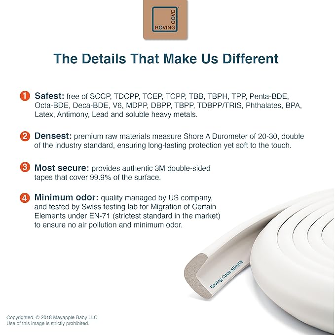 • CLEAN SAFETY: Roving Cove uses safe and pure raw material and was the first brand to make foam safety bumpers without the use of toxic flame-retardant chemicals (SCCPs). Our edge protector cushion contains no BPA, no phthalates, no heavy metals, no latex, no SCCPs. Inherently flame-resistant; passed flammability tests under US regulations.