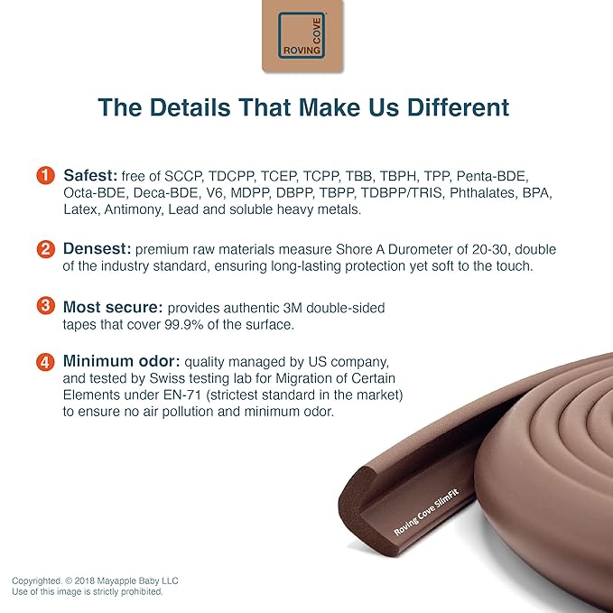 • CLEAN SAFETY: Roving Cove uses safe and pure raw material and was the first brand to make foam safety bumpers without the use of toxic flame-retardant chemicals (SCCPs). Our edge protector cushion contains no BPA, no phthalates, no heavy metals, no latex, no SCCPs. Inherently flame-resistant; passed flammability tests under US regulations.