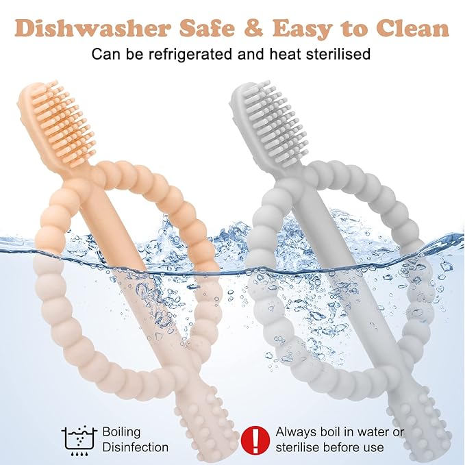Baby Teething Toys with Easy-Hold Handle, Silicone Infant Toothbrush, Textured On Both Sides Helps Massage, Soothe Sore Gums, Teething Toys for Babies 0-6 Months, 6-12 Months Peach Powder & Gray