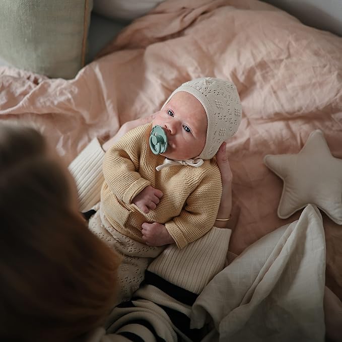 • The FRIGG line of daisy silicone pacifiers with improved SilkySoft nipple and an innovative Click-lock System has been thoughtfully designed for your baby's comfort. The outward curve keeps the pacifier off their delicate skin, while features like air holes and a security handle ensure your baby stays safe. Available in a range of soft colors, FRIGG pacifiers make a beautiful addition to your collection of baby essentials.