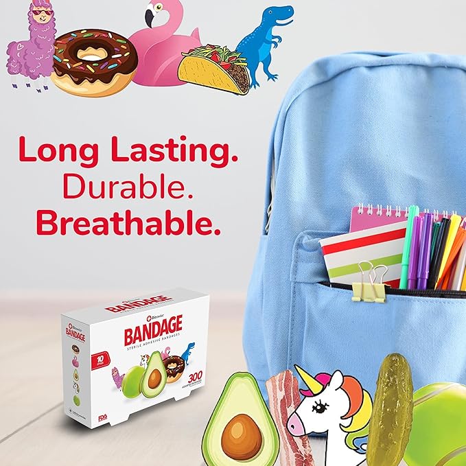 • ASSORTED BANDAGES: This 300 piece pack of adorable assorted bandages is great for putting a smile on kids' faces while protecting wounds such as cuts, scrapes, and burns, and come in 11 assorted styles (Monkey, star, llama, donut, ice cream, unicorn, cupcake, lips, bacon, mermaid, and pineapple); sticky bandages are perfect for kids and adults alike, and also for school nurses and pediatric doctors