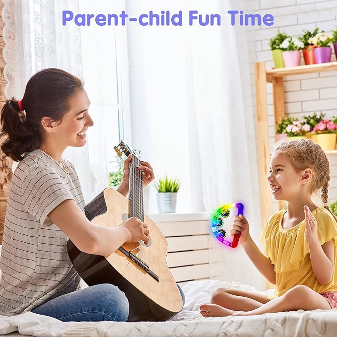 • 3 FLASHING MODES LIGHT UP MUSICAL TOYS - LED tambourine Built-in 3 lighting modes, including fast flashing, slow flashing, and alternately flashing, you can choose the flashing mode you want according to your preference or the current atmosphere. LED light up tambourine is absolutely indispensable toy to liven up the party atmosphere, and it will be a hit at your party.