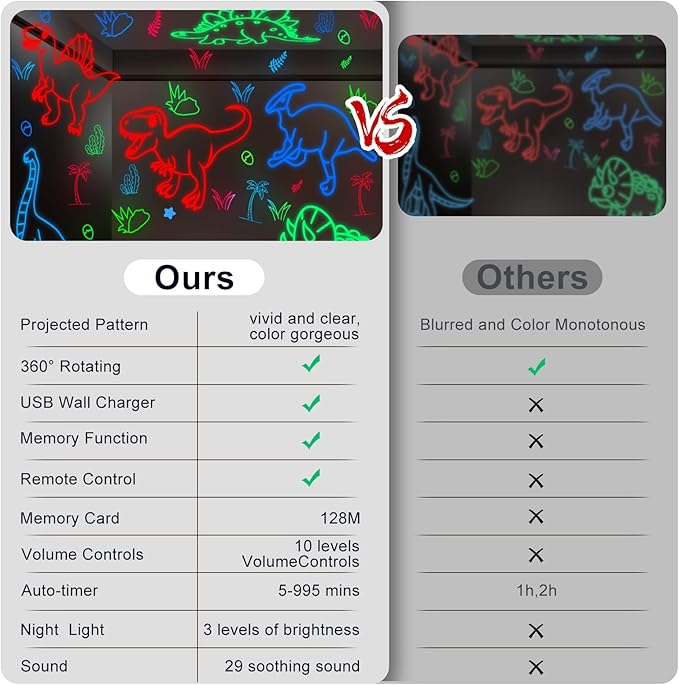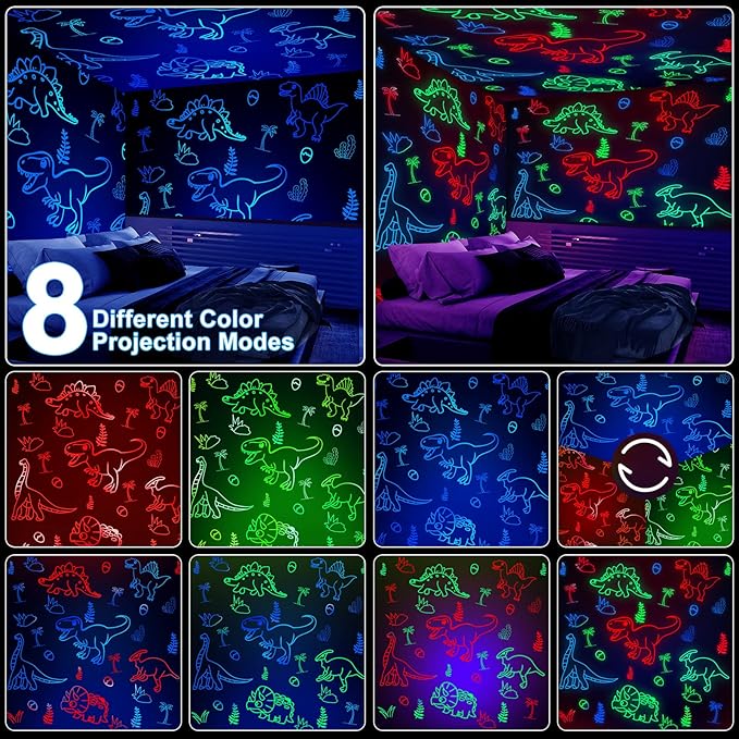 • 【ADDS A VARIETY OF FUN TO YOUR LIVING SPACE】The high-power LED lamp bead projected pattern is more vivid and clear, making the color far more gorgeous.Silent 360-degree rotating design and 8 different color lighting effects. Projects soothing images of dreamy Dinosaur on the ceiling and walls. Let your baby focus on following the spinning Dinosaur pattern to attract your baby's attention, thus calming emotions and relaxation for a quick sleep. No more struggling with bedtime!