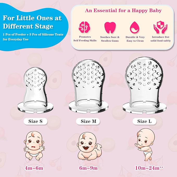 • 【TRY SOLID FOOD FLAVORS】HAOBAOBEI silicone feeder set including 2 pack baby silicone feeder with 4 silicone pouches, which is designed to fit for each age. Just put fresh fruits, food or frozen breastmilk, your baby will enjoy the taste of solid foods by chew the baby feeder.