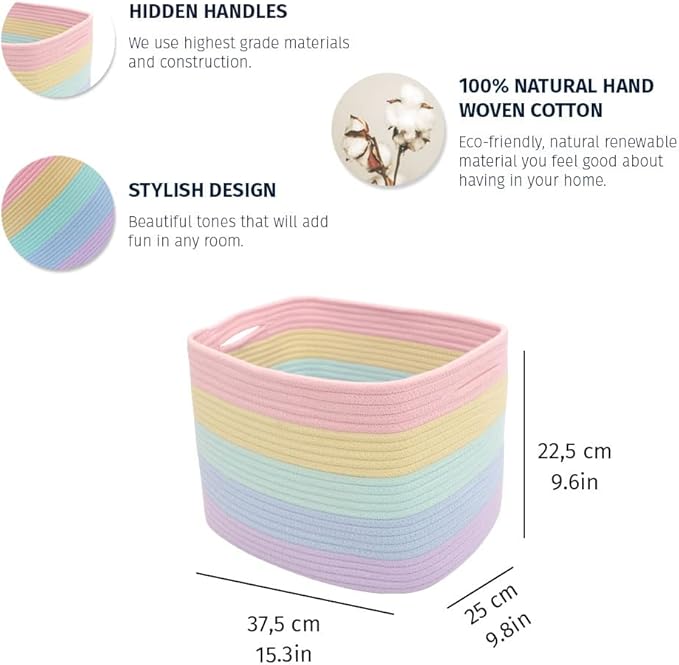 • Premium Cotton Rope Weave – These beautiful rainbow toy baskets are woven with high-quality, all-natural cotton to give them the right balance of softness and durability. This makes them great for bedrooms, nurseries, and laundry rooms as rainbow room decor.