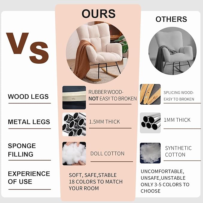 • Ergonomic & Elegant Design - High backrest and armrest provides you with great comfort and safety. Wood color legs can adorn your house. Gently rock your baby to sleep during nap time or read to your little ones in this comfy chair
