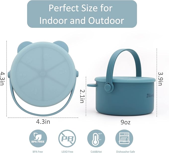 • 👶Safe for Baby: The Dilovely baby snack containers is made out of 100% food grade silicone, which is definitely safe to store food, snack or even to chew. This baby snack cups do not contain any BPA, Lead, and Phthalate.